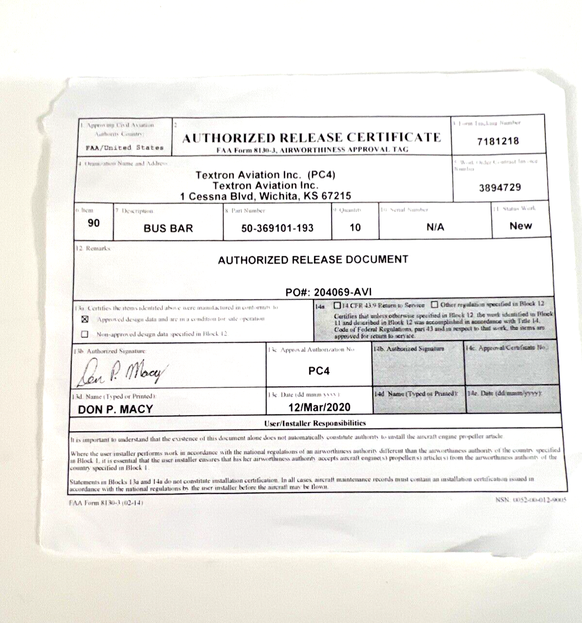 50-369101-193 Bus Bar King Air NEW with 8130