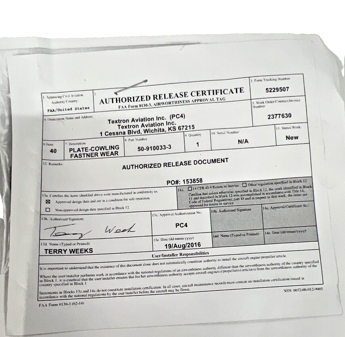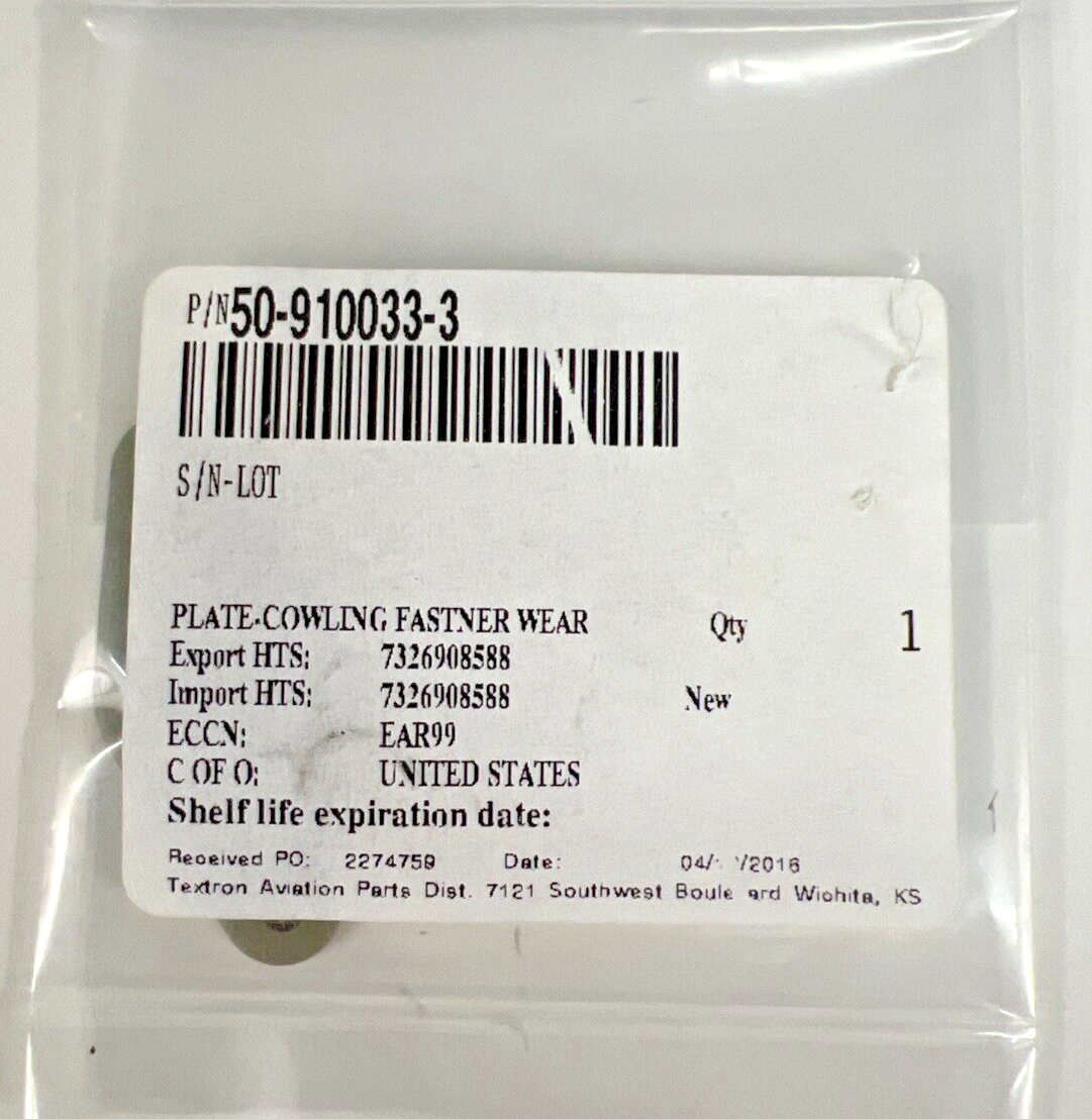 50-910033-3 Beechcraft Plate NEW with 8130Refund Policy