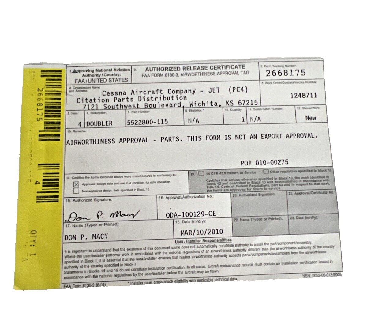 Cessna 5522800-115 Doubler Access Panel