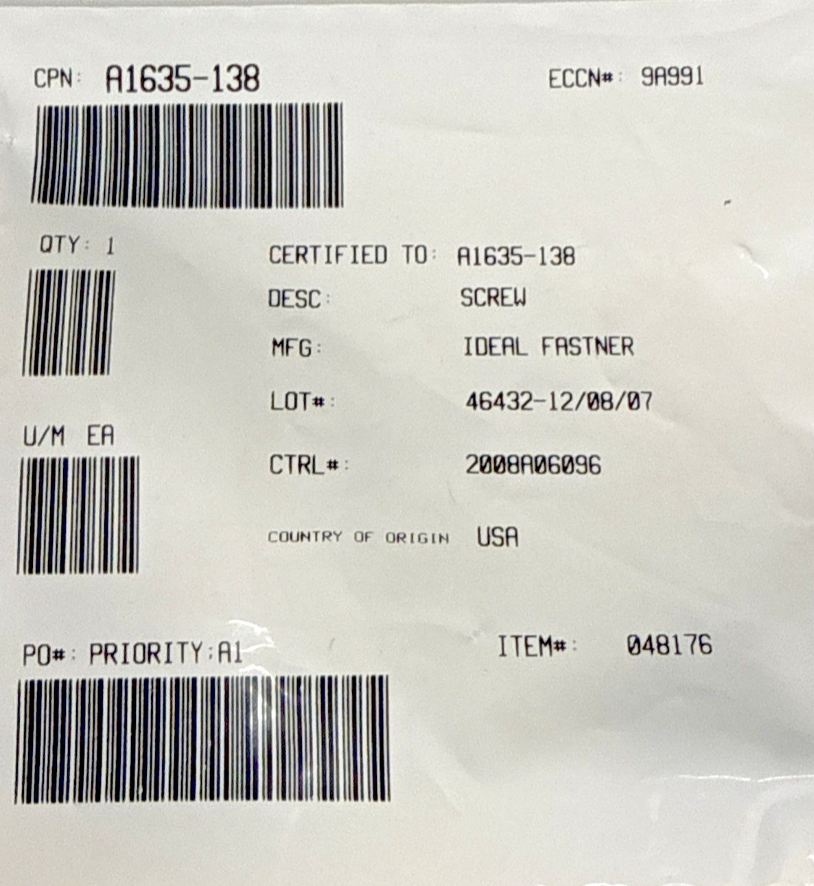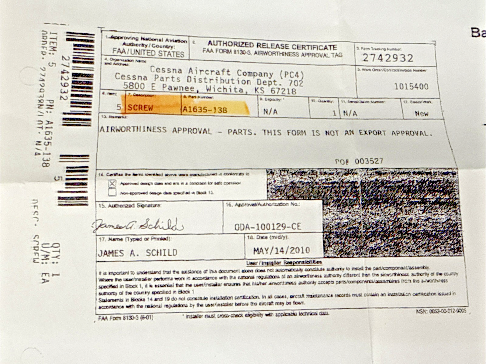 Cessna Aircraft A1635-138 Screw NEW with 8130