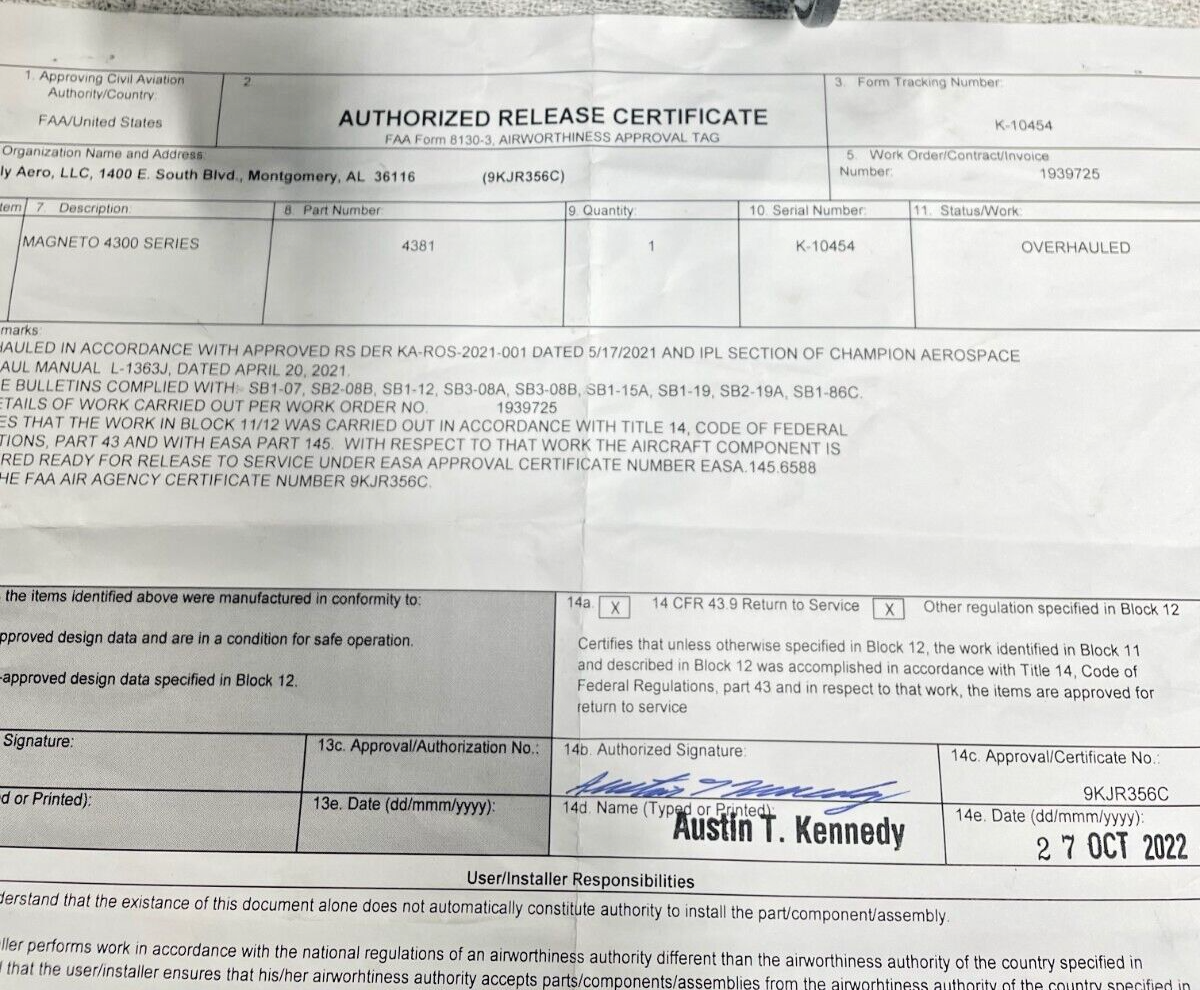 Champion Slick 4381 Magneto with Impulse with 8130 200 hours since Kelly OverhaulRefund Policy
